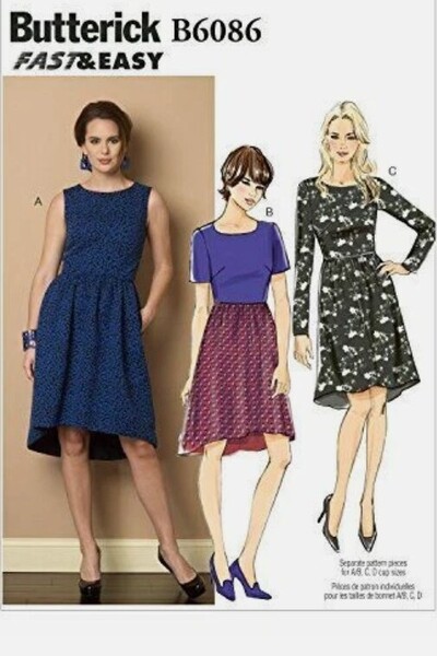 MISSES' DRESS: Lined dress with fitted bodice and gathered skirt has shaped hemline (lining fabric will show), in-seam pockets and back zipper. A: Sleeveless. B: Contrast bodice and short sleeves. C: Long sleeves. Separate pattern pieces included for cup sizes A/B, C, D. Designed for light- to medium-weight woven fabrics and medium-weight stable knits FABRICS: Gabardine, Crepes, Taffeta, Double Knits.