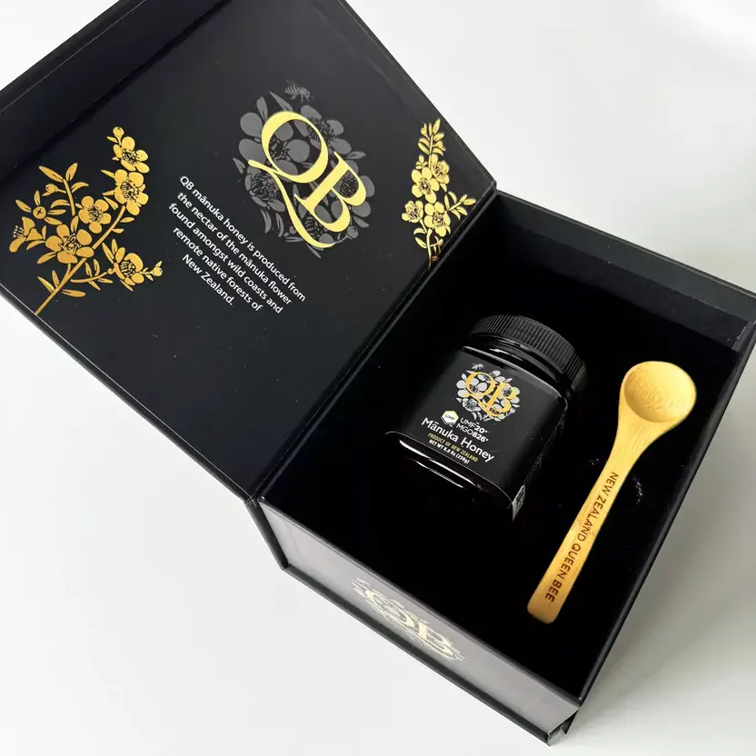 A treasure for natural health enthusiasts, this gift box features a 500g or 500g jar of QB Manuka Honey UMF 20+, renowned for its powerful organic healing properties. Perfect for those who turn to honey as a natural remedy, this premium selection supports overall wellness with every spoonful. Beautifully packaged with an engraved wooden spoon, it’s a luxurious gift for those who value purity and potency in their honey.