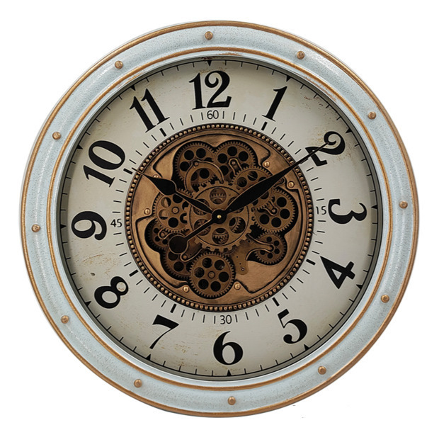 Wall clock in anodised white metal with glass cover and black arabic numerals and hands on a white face. Featuring anodised copper gears.