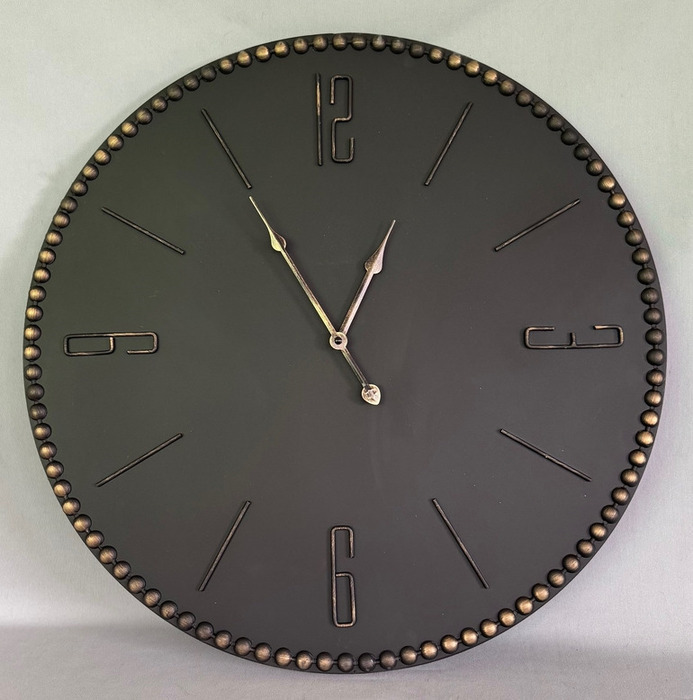 Wall clock with anodised metal black face and anodised gold Arabic numbers (in the 3, 6, 9 and 12 positions), hands and studs around the perimeter of the face.