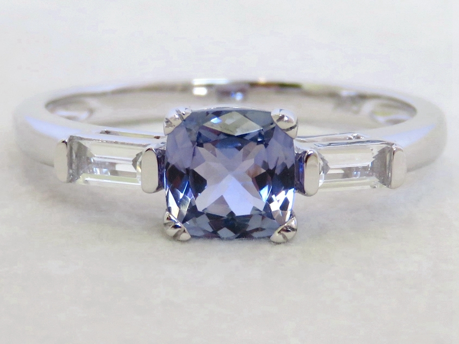 This ring features a 6mm cushion-cut natural Tanzanite as the centre stone, admired for its soft violet-blue tones and elegant depth of colour. The stone is set in a classic four-prong setting, allowing light to enhance its natural brilliance.