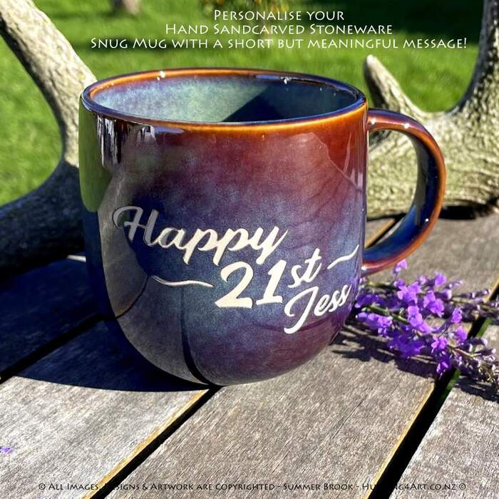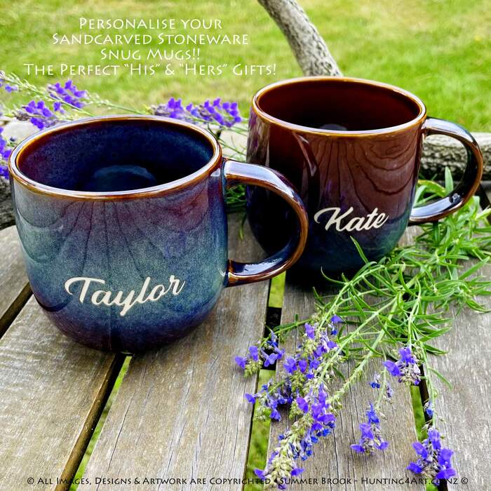 And for those of you wanting something SUPER SPECIAL, here's a little 'extra' we can offer!! If you'd like to have your snug mug PERSONALISED with a name or short message, we can do that for you too! Your mug can be left 'as is' with just the design on its own, or it can be customised just for you for just $10 more by simply clicking 'Yes' to 'Do you want this item personalised?' and filling in the 'Personalise Me!' box. Easy as!! Perfect for those special milestones like anniversaries, birthdays, weddings...or just to put your own name on your mug so everyone knows it's YOURS! We use a beautiful font that ties in nicely with the design to create your truly unique sandcarved art piece.