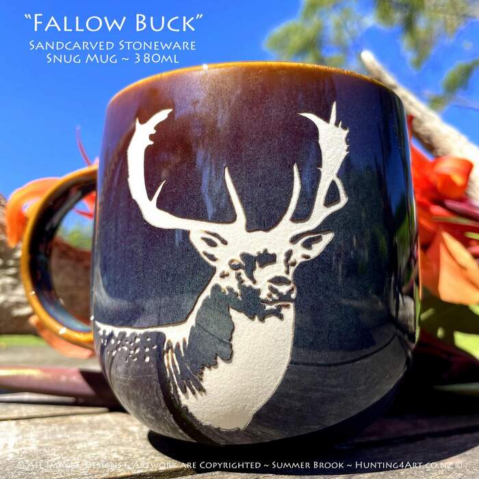 This trophy Fallow buck is one handsome brute! This beautifully crafted hand sandcarved stoneware mug is a great way to start your day off right!