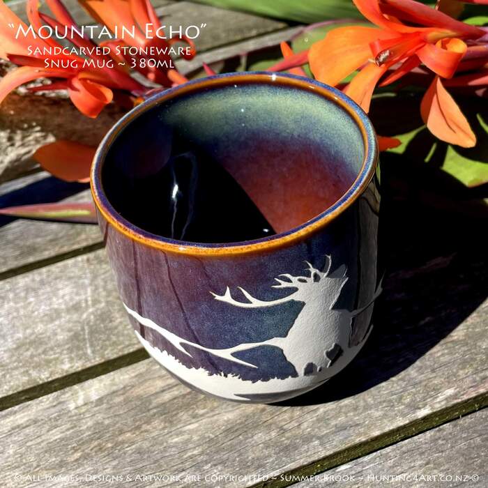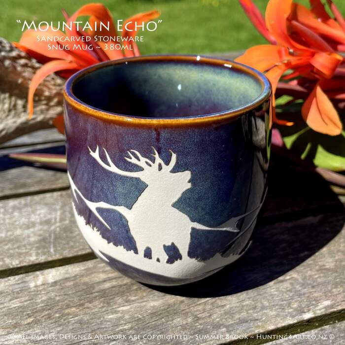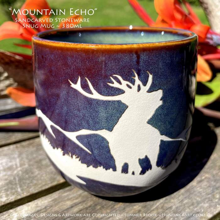 A mighty NZ red stag roaring in the mountains. This beautifully crafted hand sandcarved stoneware mug is a great way to start your day off right!