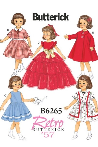 Dress A: Gathered waistline, dolman sleeves and gathered sleeve hems. Jacket B: Lined, cuffs and button closure. Dress B: Contrast bodice, pointed flat collar. Dress C: Sleeveless bodice and purchased trim on gathered skirt. Dress D: flutter sleeves and tiered skirt with contrast overlay. Dress A, B, C, D: Petticoat and lined bodice. Coat E: Lining and snap closures. Note: The proportions for dolls may differ depending on manufacturer. Adjustments to individual pieces during construction may be necessary for a better fit.