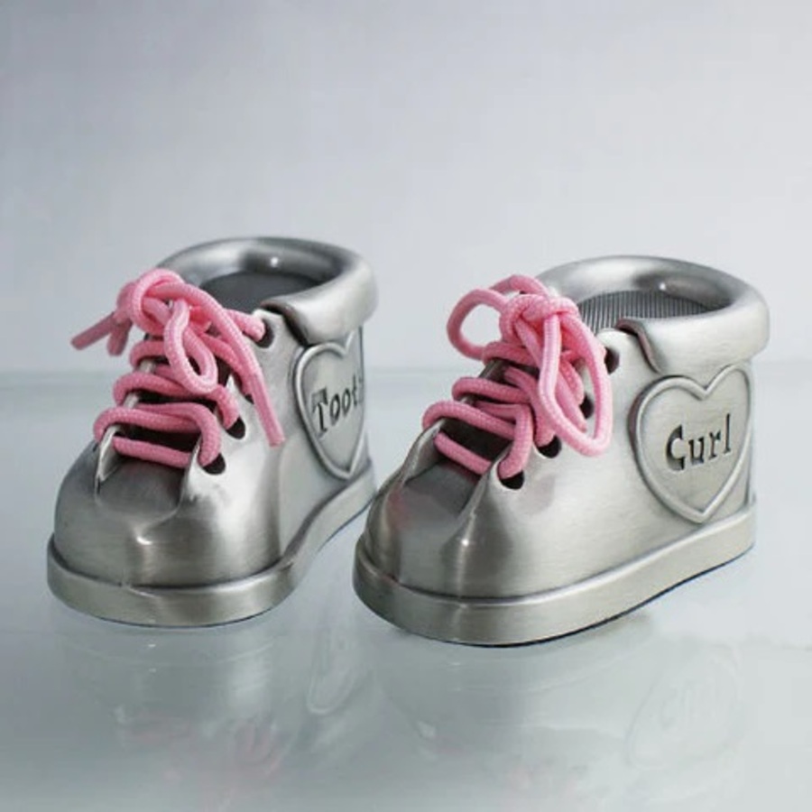 Is there a cuter way to keep baby's first lock of hair and first lost tooth safe? I'm not sure that there is. These cute pewter booties come with both pink and blue laces so you can personalise them however you please.