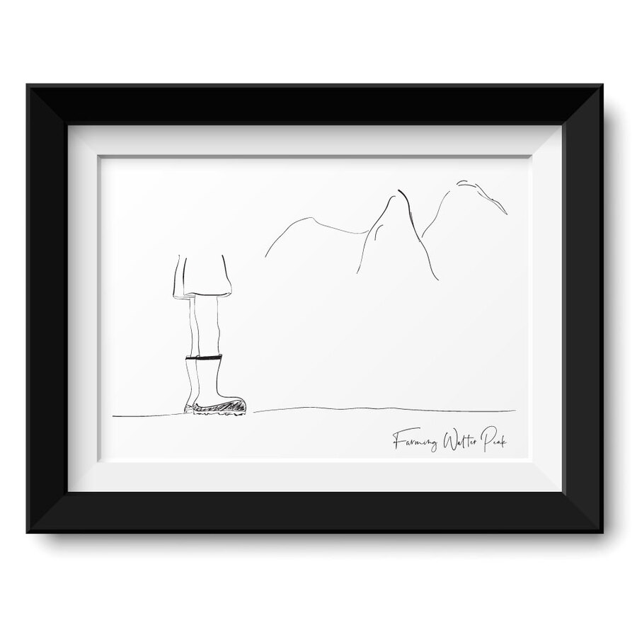 It is a minimalist line art print loosely based on a hand drawing of the rural farmland at Walter Peak, Lake Wakatipu in Queenstown, New Zealand. The artwork captures high country farming life - Red-band gumboots on pasture with the surrounding hills beyond. The simple black line style suits modern, farmhouse, and rustic interiors while keeping a strong connection to the South Island landscape. A meaningful piece for rural homes, farmhouses, offices, and anyone with ties to Queenstown or Otago. Ideal for living rooms, hallways, studies, and shared spaces. (Pictured: A2, Black Frame with Mat Board)