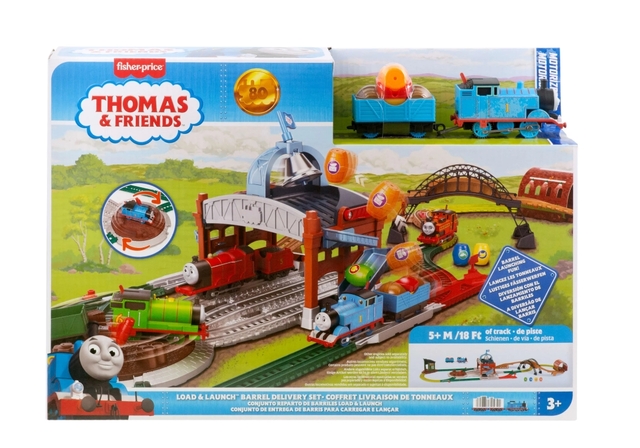 With this 80th anniversary-inspired Thomas & Friends Load & Launch Barrel Delivery Set, preschoolers can have barrels of fun just like their favorite engine and his pals! This expansive set includes a Classic Thomas motorized engine and cargo car, plus 18 feet of track and accessories to build out the world of Sodor. Flip the switch on the top of the engine to send Thomas through the tunnel and over the bridge to the delivery warehouse, where kids can load up one of four included barrels. Release Thomas to send him to the train depot, where the barrel automatically launches onto the depot's roof, ringing the bell. The turntable resets Thomas for his return to the depot, load another barrel and run again! Colours and decorations may vary.