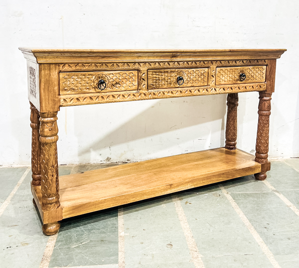 A beautiful unique console made from sustainable mango wood with hand carved detailing and a bluewash paint finish.