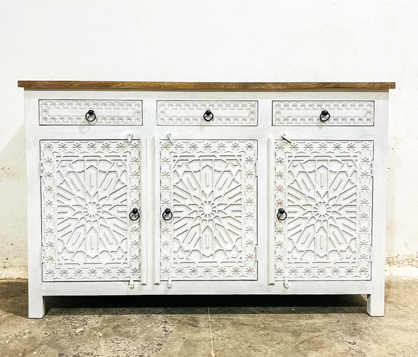 Marrakech Sideboard White is a stunning, one-of-a-kind sideboard handcrafted from sustainable mango wood with beautiful detailing and a soft whitewash finish. Handmade in India, this hardwood sideboard offers beautiful natural grain, practical storage, and timeless style for living rooms, dining rooms, and entryways. A perfect statement piece for modern, coastal, boho, or farmhouse interiors, it brings warmth and character to any home. ♥️