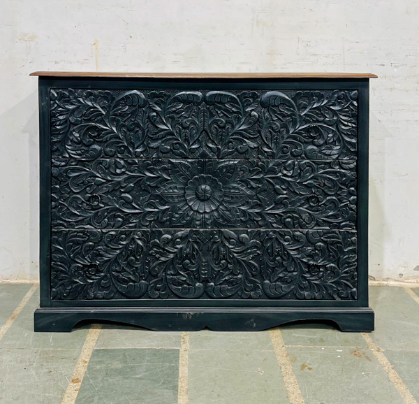 An elegant black chest of drawers handcrafted in India, featuring a beautiful hand carved decorative design this statement storage piece suits bedrooms, living rooms, and hallways. The refined carved detailing and timeless black finish add luxury to boho, coastal, and classic interiors. Ideal for stylish home storage, this handcrafted wooden drawers unit offers practical space with standout artisan character.
