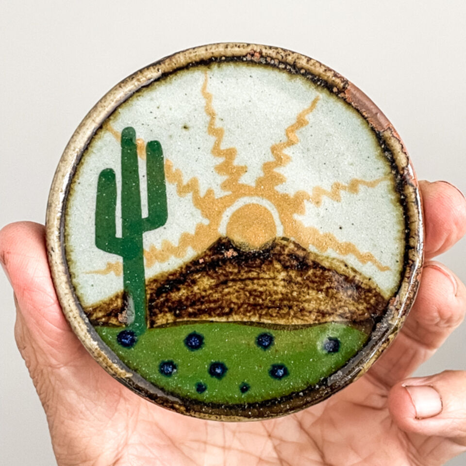 A beautiful whimsical Mexican Tonala stoneware tile, hand painted and handcrafted in Mexico with distinctive raised relief detailing. Measuring 85mm x 85mm x 10mm thick, this decorative ceramic tile adds authentic Mexican style to kitchen backsplashes, bathrooms, fireplace surrounds, and feature walls. The charming design brings colour and artisan character to any space, and it also works perfectly as a stylish coaster. Ideal for collectors and interior designers seeking handmade Mexican tiles, Talavera-style decor, and unique artisan home accents.
