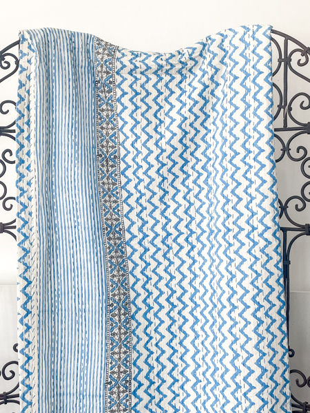 Add artisanal warmth to your space with a double layer Block Print Kantha Quilt. Handcrafted in Rajasthan, this thin, double-sided cotton kantha quilt features traditional block print patterns and authentic hand-stitched detailing. It suits a queen or king size bed and works beautifully as a kantha throw or lightweight bedspread. Expect charming loose or uneven stitching, a hallmark of genuine handmade kantha quilts. Easy care: machine wash cold. Perfect for boho, vintage, and global-inspired home décor.