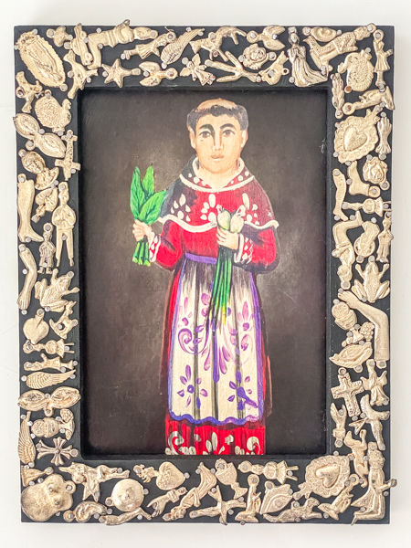 A wonderful handcrafted wooden frame covered with Milagros, or tiny miracles, are small religious charms that have been used in Mexico for hundreds of years for healing, protection and as a ritual offering to the saints.
