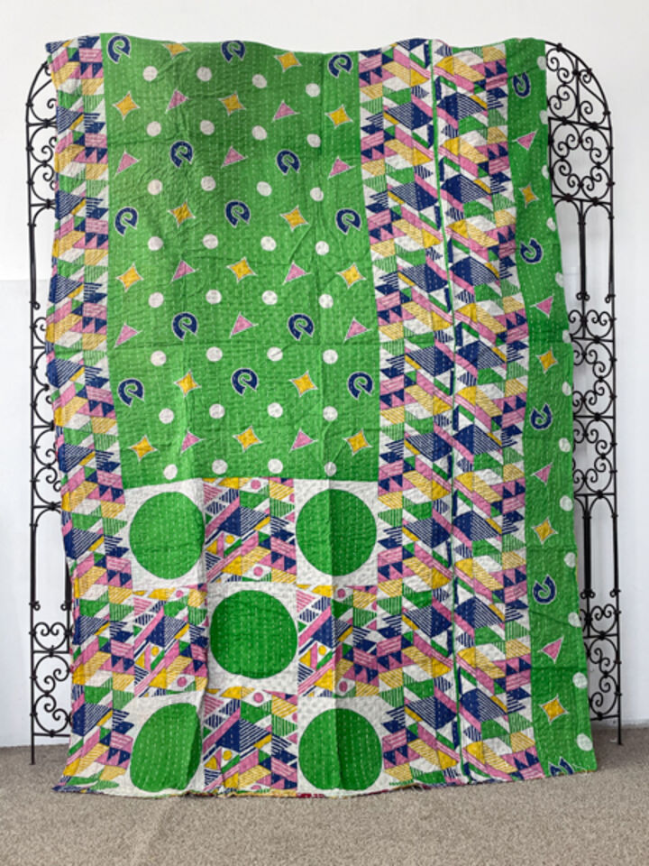 These vintage kantha quilts are a thin, double sided cotton quilt hand crafted in Rajasthan. They are made from old saris, scraps of left over textiles and each one is unique. Most of them will have small patches sewn over to patch small holes. They commonly have some loose or uneven stitching and old stains on the fabric. This is all part of the beauty of a handcrafted vintage kantha. Very awesome quilts!!