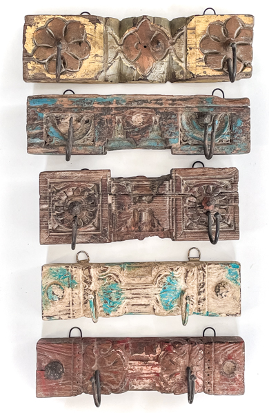 Utterly fantastic wall hooks. Made from a solid chunk of reclaimed timber with fabulous hand carved detailing and a dark brown finish.