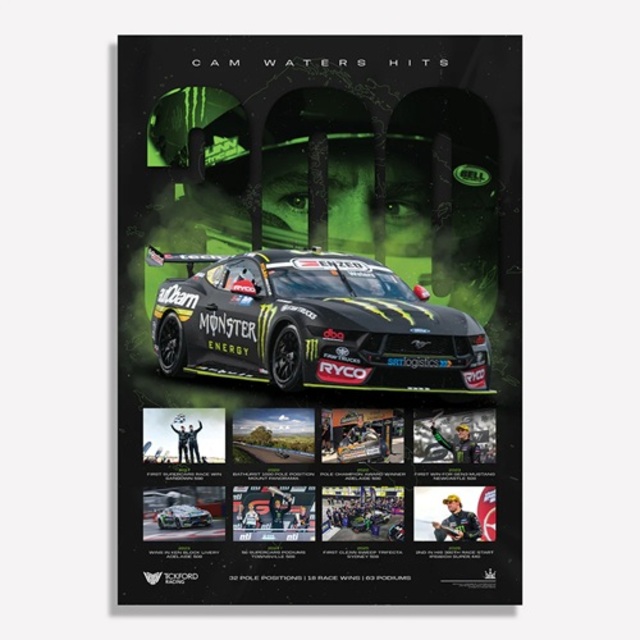 Celebrate Cam Waters’ 300 Supercars starts with this limited edition A2 print, featuring his Ford Mustang and key career highlights from 2017–2025. Designed in a bold green and black style, it includes standout stats like 32 poles, 18 wins, and 63 podiums.