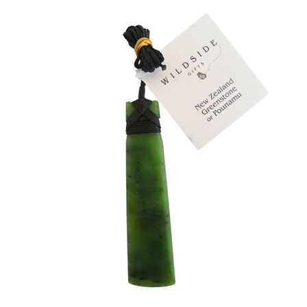 A beautiful long New Zealand Greenstone Toki about 102mm long by 26mm wide bound with an adjustable waxed chord.