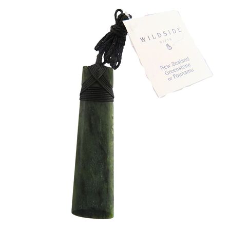 An impressive, dark green New Zealand Greenstone Toki that is 108mm long by about 34mm wide at its widest point. Bound with black waxed, adjustable chord. Carved in Taranaki, New Zealand.