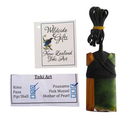 Each Art Toki is a unique design, made in Taranaki New Zealand. This one is made with New Zealand Greenstone, Paua and recycled Rimu in resin and bound with an adjustable waxed chord.