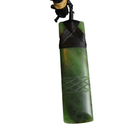 A beautiful long Pounamu Toki 90x22mm long. Carved in Taranaki New Zealand. Bound with an adjustable black chord.