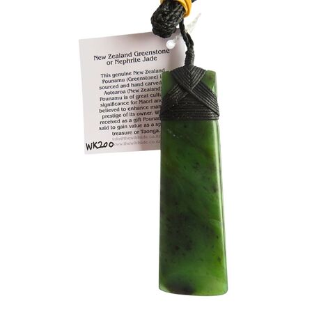 A beautiful dark green New Zealand Greenstone pendant or Toki (102mm long by 31mm wide at the widest point), bound with an adjustable black chord.