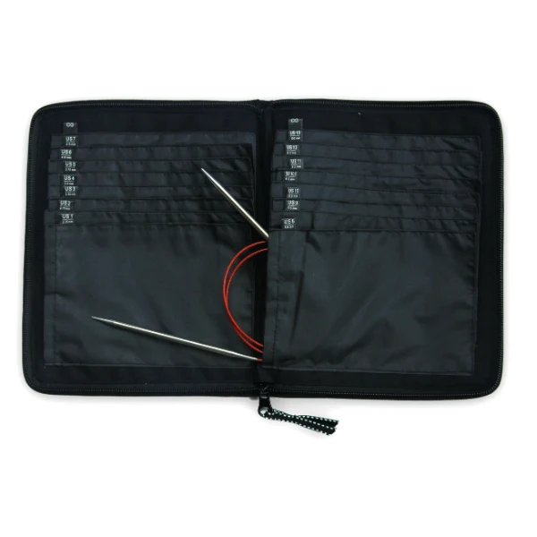 Slightly larger than our interchangeable case, this quality, book-style, cotton fabric case is completely enclosed with a zipper on three sides. Inside are 16 labeled pockets to hold your circulars. Notions can be stored in the zippered, outside pocket. Closed case dimensions are 9″ (23cm) x 7″ (18 cm).